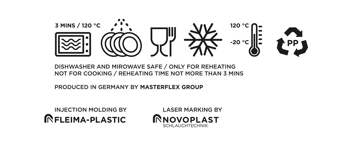 These components of the article are suitable for use in a microwave oven (max. 3 min. at up to 120 °C) for reheating food - not for cooking. Even in a dishwasher, this temperature is not usually exceeded.