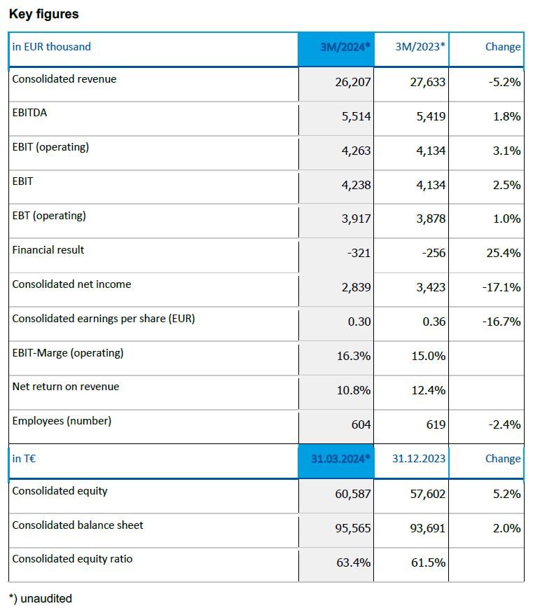 At net level, consolidated net income totaled EUR 2.8 million (3M/2023: EUR 3.4 million. Accordingly, consolidated earnings per share totaled EUR 0.30 (3M/2023: EUR 0.36). The decline in earnings at net level is due to higher financing costs as a result of the rise in interest rates and, in particular, a positive tax effect in the same period of the previous year.
